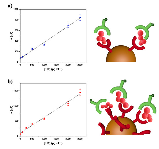 Calibration curves constructed for the amperometric determination of ST2 with immune platforms prepared from MBs modified with (a) 10 µg mL–1 or (b) 50 µg mL–1 anti-ST2-CAb solutions. Comparative fictitious pictures of the anti-ST2-CAb loading onto the magnetic immunoconjugates are also shown.