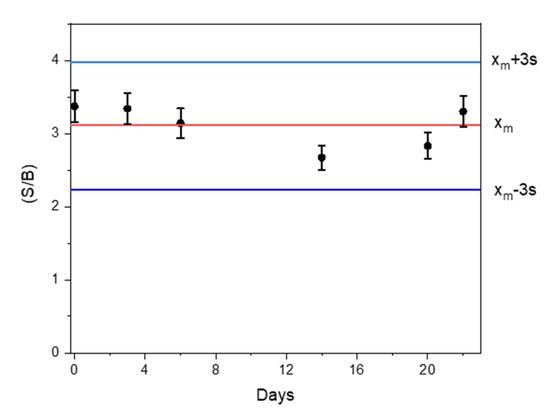 Stability of anti-ST2-CAb-MBs immunoconjugates stored in filtered PBS at 4 °C after their preparation. S/B ratio values were obtained for 0.0 and 1000 pg mL–1 ST2 standards with immune platforms prepared from the stored immunoconjugates each control day. Control limits (blue lines) were set as ±3 s of the mean value obtained the first day of the study (n = 3).