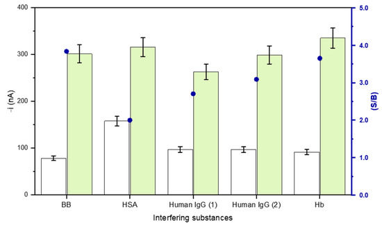 Amperometric measurements carried out with the developed immunosensor in the presence of different serum proteins: 0.0 (white bars) and 1000 pg mL–1 (green bars) ST2 standards (and the corresponding S/B ratio, blue dots) prepared in the absence or in the presence of 5.0 mg mL–1 HSA, 1.0 and 0.1 mg mL–1 human IgG (human IgG (1) and (2), respectively) and 5.0 mg mL–1 Hb.