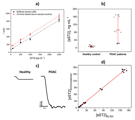 Due to the demonstrated absence of the matrix effect, quantification was performed by simple interpolation of the amperometric responses provided by the immunosensor for plasma samples diluted 25-fold or 50-fold for healthy subjects or PDAC patients, respectively, into the calibration plot constructed with ST2 standards.