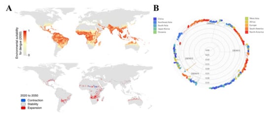 (A) Worldwide estimated distribution of dengue in next 30 years due to the climatic and population change [8]. (B) Phylogeny analysis of 922 complete genomes evolution of all DENV serotypes reported from January 2000 to October 2020 based on their origin. (Source: Nextstrain.org (accessed on 15 May 2020)).