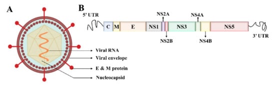 Electron microscopy imaging demonstrates that DENV has a relatively smooth surface, 40–60 nm size, and contains 25–30 nm nucleocapsid protein covered with a lipid bilayer (Figure 2A) [33,34]. The DENV is a positive-sense ssRNA virus that can be translated directly to proteins [1]. The complete genome is ~11 kb-long, encoding for three structural and seven nonstructural proteins, and the subtypes of DENV share about 65% of the complete amino acid sequences (Figure 2B) [1,35]. E, C, and prM/M are the structural proteins, while the nonstructural (NS) proteins are named NS1, NS2A, NS2B, NS3, NS4A, NS4B, and NS5 [35,36]. DENV also contains two untranslated 5′ and 3′ terminal regions in the genome [37,38]. The virus is structured with Envelope/E protein with 495 amino acids and consists of three domains that mainly interact with the host cell for invasion [39].