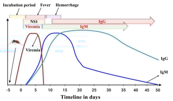 The incubation period for dengue fever is usually five days, and the acute illness can be observed from 0–7 days of disease infection, and sometime after that period, some patients experience hemorrhagic shock. During the early stage of infection, viral load measurement can be done using RT-PCR or any other molecular detection method. Simultaneously, NS1 can also be diagnosed up to 10 days of infection by ELISA method. IgM or IgG based testing is useful to diagnose dengue infection after a few days of infection.