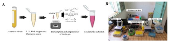 Detection of DENV RNA using isothermal amplification based platforms. (A) Detection of DENV RNA using LAMP method, initially RNA is transcripted to dsDNA and then amplified by the primers creating a loop structure (Modified from [107]). (B) A mobile laboratory to be used at point of care to detect DENV using RPA method utilizing minimal reagents as well as equipment (reprinted from [124]).