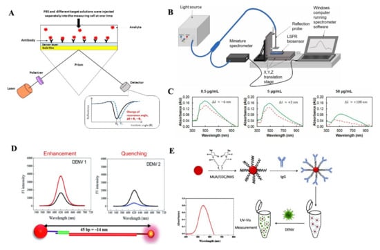 Detection of DENV viral biomarkers using surface plasmon resonance technologies. (A) An Au thin film based graphene oxide-polyamidoamine dendrimer based SPR sensor mechanism represents to measure the change in the SPR angle in present of DENV viral proteins (Reprinted from [128].). (B,C) Silver nanostructured SPR biosensor experimental setup to detect different concentration of NS1 antigen by measuring the peak wavelength shift on the chamber of a nanostructured device. NS1 antigen (green solid line), and anti-NS1 antibody (red dashed line) (Reprinted with permission from ref. [130]. Copyright 2019 Elsevier.). (D) Detection of different DENV serotypes based on altered distance based fluorescence signal (LSPR Enhancement and quenching) generated by primer–probe conjugated quantum dots and AuNPs (Reprinted from [133]). (E) AuNPs surface was modified by a self-assembled monolayer of MUA which facilitated covalent bonding of the DENV specific antibody with the AuNPs. (Reprinted with permission from ref. [134]. Copyright 2018 Elsevier.).