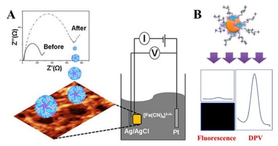 Electrochemical detection of DENV. (A) Electrochemical impedance sensing technique for DENV detection using graphene oxide and polymers (Reprinted with permission from ref. [154]. Copyright 2017 Elsevier.). (B) DENV virus detection using differential pulse voltammetric method utilizing a combination of nano composites (Reprinted with permission from ref. [160]. Copyright 2018 American Chemical Society.