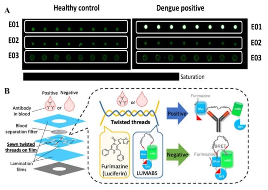 (A)Detection of DENV using peptide microarrays. Differentiation of healthy and DENV infection patients’ sera by spotting the fluorescence (reprinted from [200]). (B) Detection of anti-DENV-1 antibody from whole blood using an intertwisted thread-based analytical device (Reprinted with permission from ref. [206]. Copyright 2020 American Chemical Society).
