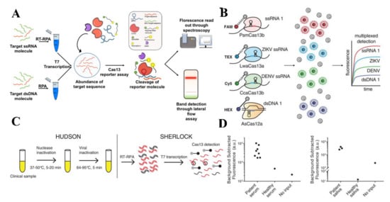 - Gootenberg, J.S.; Abudayyeh, O.O.; Kellner, M.J.; Joung, J.; Collins, J.J.; Zhang, F. Multiplexed and portable nucleic acid detection platform with Cas13, Cas12a, and Csm6. Science 2018, 360, 439–444. [Google Scholar] [CrossRef] [Green Version]