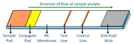 The architecture of a typical LFIA test strip is indicated in Figure 1. The sample under test is dispensed onto the sample pad of the cartridge. It then migrates onto the conjugate pad, wherein particulate conjugates are immobilized, which can be fluorescent or colloidal gold or paramagnetic monodispersed latex particles [16,17]. The sample analyte remobilizes the dried conjugate, and then both migrate through the nitrocellulose (NC) membrane. The sample flows through the membrane due to the capillary action of the strip material [2]. The sample reacts with test-specific antigens/antibodies immobilized at test and control lines within the NC membrane. The sink pad/wick provides a dry region to maintain the capillary flow of the sample through the membrane as long as the liquid is present in the sample pad and prevents backflow of the sample [16]. Fluorescence-conjugated particles are advantageous over other optical labels with respect to the improved orders of sensitivity and dynamic range [18]. With fluorescence labels, it is feasible to provide a quantitative estimate of target analytes [10,19]. For this, the sample reaction, which is a function of emitted light intensity at the test and control lines, has to be measured and analyzed, which demands a reliable reader instrument. Quantitative measurements are made once the sample reaction becomes stable.