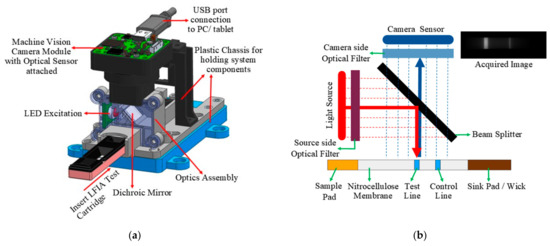 The hardware architecture of the designed LFIA reader is as indicated in Figure 2. The main components of the system design include the excitation source, the confocal optical arrangement, and the sensing module. A high-power red LED source R42180-06 (Seoul Semiconductor, Ansan-si, Korea) with a 127° view angle emitting 630 nm wavelengths is used for excitation. To filter the narrowband excitation from LED, a passband filter is used on the source side (Omega Optical Inc., Brattleboro, VT, USA), passing wavelengths below 640 nm. The LFIA cartridge under test is placed at the bottom side of the optical reader, as shown in Figure 2a. The camera captures corresponding fluorescence emitted from the cartridge, which has a wavelength of around 665 nm. For facilitating this, the excitation source and the sensing modules are fixed in a confocal arrangement, as shown in Figure 2b. It primarily involves a dichroic mirror (Omega Optical Inc., USA), which reflects wavelengths below 650 nm and passes wavelengths greater than 650 nm. It is placed at a 45° angle between the source and sensing element. The dichroic mirror reflects the excitation beam incident at 45° to its surface onto the cartridge. Similarly, the emitted fluorescence incident at a 135° angle to the mirror can pass through it. A sharp, custom-made bandpass filter (Omega Optical Inc., USA), which passes wavelengths between 655 nm to 721 nm, is placed on the camera side. When a cartridge is inserted into the reader, the LED excitation source is turned on. The camera side filter, along with the dichroic mirror, helps in capturing only the emitted fluorescence, eliminating the background. The above-mentioned light excitation source and the filter cut-offs are selected based on the Alexa Fluor 647 dye used in our LFIA cartridges. Different manufacturers can use a different dye for fluorescence. Based on the dye chosen, the light source and filter cut-offs can be changed. The overall system arrangement remains the same.