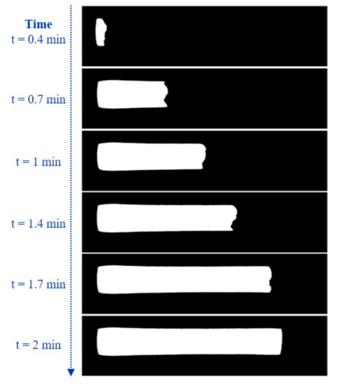 From the obtained binary map for the input image, pixels are verified for 8-neighbourhood connectivity. Pixels are grouped into individual segments if they are connected horizontally, vertically, or diagonally. Hence, all the pixels corresponding to the flow are grouped into a single segment. There could be few undesired random dot-sized pixels that are segmented as binary ‘1’. To eliminate these pixels and segment out only the flow area of interest, we apply an area filter to consider only the components with an area size greater than 0.003 mm2. This is evaluated for each of the averaged image frames captured for every 20 s, and the track of the sample flow through the NC membrane is observed. Figure 5 indicates the flow progress as captured for HbA1C test cartridges.