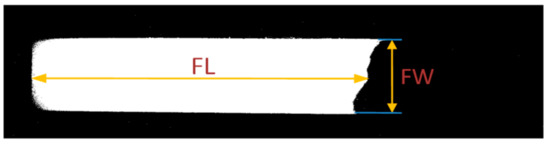 The properties, including width, length, and area of the segments, are evaluated as the sample flow progresses and verified for any irregularities. Flow length (FL) is evaluated by determining the number of pixels in the mid-row of the extracted flow segment as indicated in Figure 6. Similarly, flow width (FW) is the number of pixels in the mid column of the segment, while the flow area (FA) is the total number of pixels in the segment. Ideally, as the sample flows through the membrane, the flow length and flow area start increasing and stabilize after a few frames. Flow width should remain constant throughout and should be the same as the width of the NC membrane. The speed of the sample flow within the membrane also impacts the reaction at test and control lines. The frame-to-frame flow speed (FS) between the test instances is measured by determining the change in flow length (FL) within the time interval as indicated in (2).