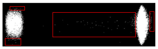 Here, NCM (t)(x,y) and B(t)(x,y) indicate the fed NC membrane and the corresponding binary map obtained at a time ‘t’, and (x,y) indicates the pixel location and the reaction threshold value set is indicated as RT. The binary map B(t) obtained has to be further processed to appropriately extract the individual test and control area components by verifying the pixel connectivity. Each of the components is labelled and can be independently accessed. To eliminate the dot-pixels segmented as indicated in Figure 8, an area filter is applied. The resulting area-filtered binary map AFB (t)(x,y) should ideally consist of two components corresponding to the test and control regions, which are classified, respectively, by determining the center locations of the components. The test and control regions’ segmented image (SI (t)(x,y)) is derived by multiplying the binary map with the input frame I(t)(x,y) as indicated in (4)