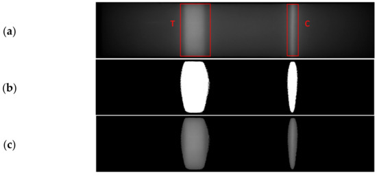 (a) The test (T) and control (C) lines indicated for a sample image captured. (b) Corresponding binary maps obtained. (c) Test and Control regions segmented out.