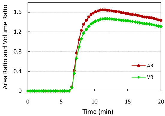 The trend of area ratio (AR) and volume ratio (VR) values measured with increasing time for a sample HbA1C test cartridge.