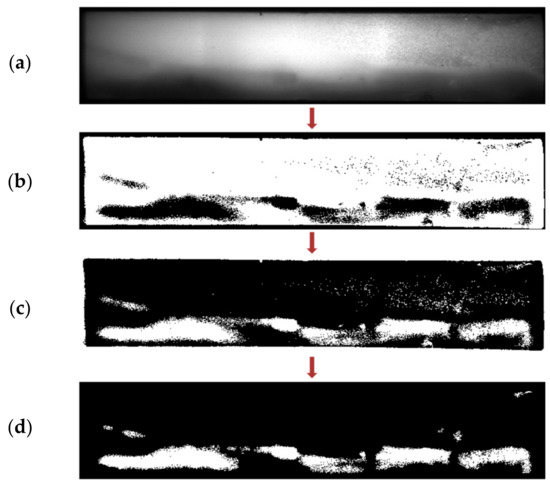 where I is the input image frame and N is the number of pixels in the neighborhood, N = w × w. If a pixel value is less than its corresponding local mean value by ‘t’ percentage, it is mapped to binary ‘0’, otherwise to ‘1’ as indicated in Figure 12b. The value of ‘t’ is preset. The binary map obtained is inverted, i.e., subtracted from 1, making the skewed flow foreground, as shown in Figure 12c. The dot-pixels and the corner segments are trimmed as in Figure 12d. The final flow segmented map area is calculated, and if it is greater than 5% of the map size, the irregularity is detected, and the user is alerted.