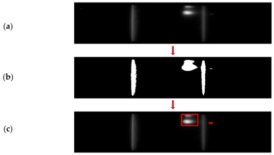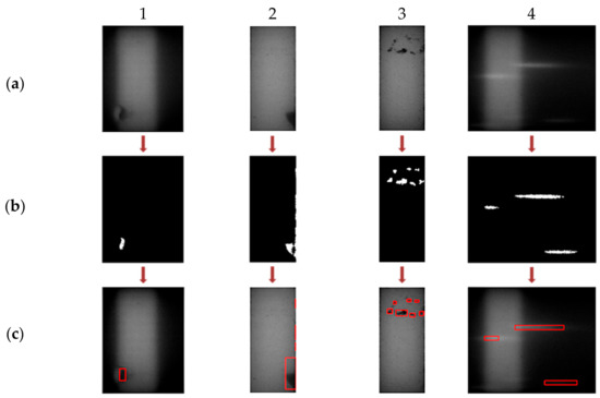 (a) Image frame captured for the detection of bright spots within NC membrane. (b) Corresponding binary map obtained. (c) Anomalies detected with the algorithm.