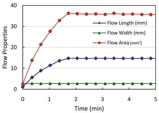 The measured flow length, width, and area for a sample HbA1C cartridge with respect to time using blood samples.