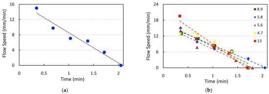 The algorithm also provides the manufacturer with information on the flow speed of the sample—this aids in the practical evaluation of the capillary flow of the NC membrane material. Figure 16a indicates the frame-to-frame change in the flow speed for a particular cartridge under test. It can be observed that flow speed decreases linearly and becomes zero at around time t = 2 min. This provides the manufacturer with a track of how the sample flow rate is practically occurring. Any deviation from this trend, including the time taken for the flow to reach, can be observed during the test cartridge design and development phase. The flow speed measurements done for five different test samples are indicated in Figure 16b. We can notice that the sample flow is reached for all the test cartridges within a time interval of 1.5–2 min. Based on these measurements, the manufacturer can make a relevant decision on whether any modifications in the design are required.