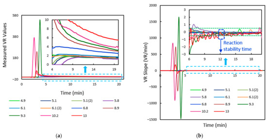 (a) The volume ratio values measured for 10 HbA1C test cartridges of different concentrations. The inset image depicts the graph zoomed-in from time t = 4 min to t = 20 min. (b) The corresponding trend of change in VR slopes with time, the zoomed-in graph from time t = 6 min to t = 20 min indicated as well.