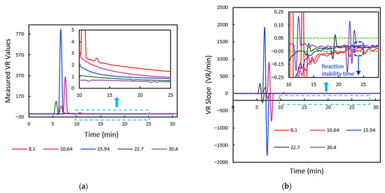 A similar analysis was done for Vitamin D using serum samples to demonstrate the evaluation for the reaction time algorithm. Image samples were acquired for 30 min. The trend of the VR values and the corresponding slope plots obtained with respect to time is indicated in Figure 18. It can be noted that the VR slopes are zero for the initial few frames. This duration includes the time for the sample front to reach the end of the membrane as well as the time before the test line forms, thus making the volume ratios zero. Once the test and control regions are detected, the reaction progress is observed, and the slopes can be seen to be changing rapidly. The VR rate for 95% of the samples falls within the ±0.05 band at around 24 min. This is the reaction stability time for Vitamin D samples of the current set of cartridges used. Quantitative measurements for clinical diagnostics must be made at this time.