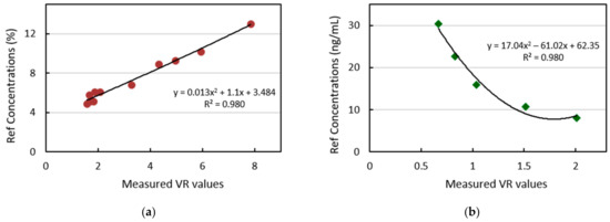 Once the stability time is determined, calibration of the test concentrations is performed by the kit manufacturers. The VR values measured for the samples under test at the reaction stability time are used to establish the calibration of sample cartridges. Figure 19a shows the calibration curve attained for the HbA1C test samples with varying concentrations in the range of 4–14%. As the stability time was determined to be 12 min, the volume ratio values measured at this time instant are used for calibration. Similarly, the calibration curve is obtained for Vitamin D test samples with the VR values measured at time t = 24 min. Five different Vitamin D samples of 8.1–30 ng/mL concentrations are used for setting the calibration curve for demonstration purposes, as indicated in Figure 19b. In practice, the kit manufacturer could use an increased number of samples to improve the calibration accuracy.