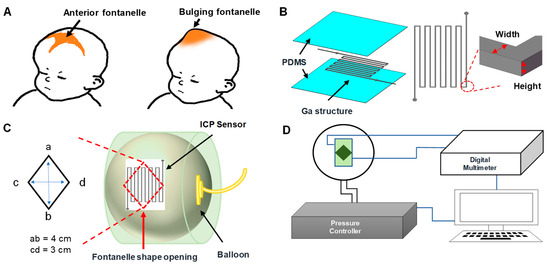 It has been proposed that the anterior fontanelle, the soft area of the unformed skull on a new-born baby, can be used as a site for detecting the increased intracranial pressure (ICP) of infants [1,2]. ICP levels for normal infants are 5–10 mbar and the ICP beyond these values may be the clinical expression of several intracranial pathologies [3,4,5,6,7]. In addition, increased ICP of infants not only interferes with normal brain development but also causes the fontanelle to bulge out significantly (Figure 1A). Unfortunately, monitoring the ICP of infants is not easy as commonly used conventional systems are either too expensive (i.e., non-invasive methods) or designed for adult patients and too big (i.e., invasive methods) for infants, which can bring larger pain and easily cause infections to infants having weaker physical conditions and immune systems. In such circumstances, an ICP monitoring sensor that can be easily used for infants in a non-invasive manner may be of a significant value.