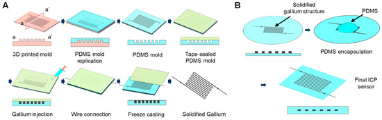 A novel freeze casting method was developed to easily fabricate a thin liquid metal structure. The overall freeze casting fabrication process of the Ga structure is illustrated in Figure 2A. First, a 3D printed mold for replicating a PDMS mold to freeze and cast the Ga structure was prepared. The mold was designed using the 3D CAD software (SolidWorks Corporation, Waltham, MA, USA) and was printed with a high temperature molding resin (HTM140 V2, EnvisionTEC Inc., Gladbeck, Germany) using a stereolithography type 3D printer (PERFACTORY®, EnvisionTEC Inc., Gladbeck, Germany). The printed mold was rinsed with isopropyl alcohol (IPA) for 5 min and dried with N2 gas, followed by additional exposure to UV lights for 500 s (OmniCure, Excelitas, Mississauga, ON, Canada). The 3D printed mold was then coated with trichloro (1H, 1H, 2H, 2H-tridecafluoro-n-octyl)silane (T2577, TCI, Tokyo, Japan) to facilitate the detaching process and the uncured PDMS (elastomer base and curing agent mixed at 10:1 ratio) was poured onto the 3D printed mold, followed by curing in an 80 °C oven for 4 h. The replicated PDMS mold was sealed with a Kapton tape® (Misumi Group Inc., Tokyo, Japan), and liquid phase gallium (Ga) was injected with a syringe. The Ga was heated to 80 °C prior to the injection to ensure and maintain its liquid phase during the process. Ga was chosen as the liquid metal material for the ICP sensor due to its higher freezing temperature (melting point = 29.8 °C). After Ga injection, two copper wires were inserted into each end of the serpentine structure to make electrical contacts, followed by solidifying it inside a −20 °C freezer for 15 min. Upon solidification, the sealing tape was removed and the solidified serpentine-shaped Ga structure was peeled off from the PDMS mold. As shown in Figure 2B, the Ga structure was then immediately placed on top of a PDMS membrane prepared by a spin-coating process and additional uncured PDMS was poured for encapsulation, followed by curing at 80 °C for 4 h to obtain the final ICP sensor (thickness: 500 µm).