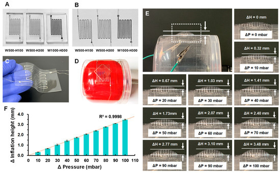Solidified Ga structures of three different designs with contact wires (A) in the PDMS mold after incubating in a −20 °C freezer and removing the sealing tape and (B) after peeling off from the PDMS molds. Image of (C) the final ICP sensor and (D) the artificial fontanelle model assembled with the ICP sensor. A red balloon was used for visualization purposes. (E) A balloon-in-box fontanelle model assembled with an ICP sensor (W500-H300), showing different inflation heights at different pressure levels. (F) Correlation between the applied pressure and the inflation height of the fontanelle model (R2 = 0.9998).