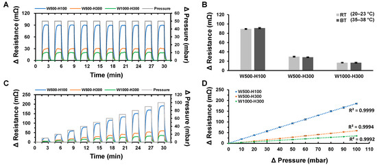 Stability/reliability of the developed ICP sensor was investigated by applying a periodic pressure of ΔP = 0 mbar and ΔP = 50 mbar with 180 s intervals. As shown in Figure 5A, the variation of the electrical resistance values was very consistent from measurements to measurements for all designs. The average ΔR values are 89.51 ± 0.35 mΩ (W500-H100), 30.04 ± 0.37 mΩ (W500-H300), and 20.25 ± 0.42 mΩ (W1000-H300), with CV being only 0.0039, 0.0124, and 0.0206, respectively. The stability/reliability of the ICP sensor was further investigated by analyzing ΔR at two different temperature conditions; room temperature (RT = 23–25 °C) and body temperature (BT = 35–38 °C). When ΔP of 100 mbar was applied, differences of ΔR between RT and BT were insignificant, with ΔRBT/ΔRRT being only 2.1%, 4.1%, and 0.7% for W500-H100, W500-H300, and W1000-H300, respectively (Figure 5B). A more important thing to note is that measurement of ΔR was very consistent and stable at both tested temperatures. These results successfully demonstrate that the developed sensors can stably monitor the ICP over time regardless of the temperature variation within the operating temperature range (23–38 °C).
