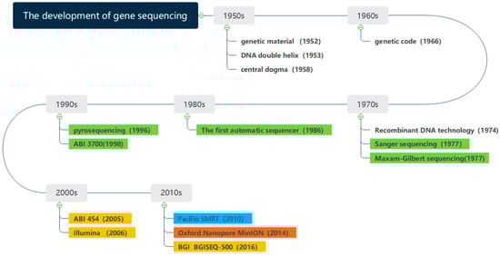 Figure 1 shows the development of gene sequencing technology. Since the 1950s, the determination of DNA double helix structure has preluded the research of genes. With the development of sequencing technology, the milestones have been made in gene sequencing. The whole genome of phage φ174 DNA was sequenced in 1977 [5], which marked the completion of the first genome sequencing in history. The Human Genome Project [6], proposed in 1990, laid a solid foundation for the further study of the human genome. The sequencing of Saccharomyces cerevisiae was completed in 1996, which completed the eukaryotic genome for the first time. The gene sequencing technology has been constantly innovating and evolving in the direction of lower cost, higher throughput, and faster speed [7,8,9,10,11,12,13].