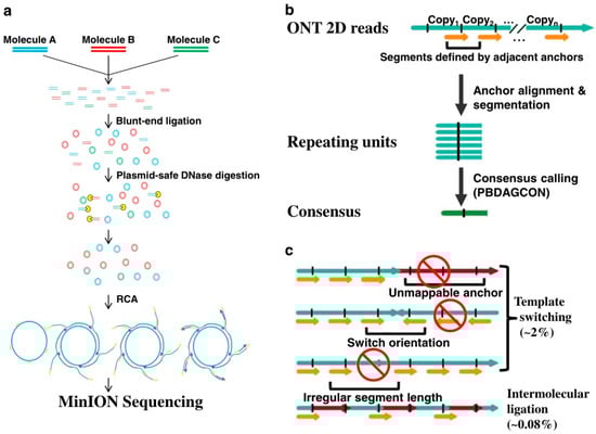 The schematics of INC-seq sequencing technology show (a) the process of making RCA, (b) the process of locating the repeat sequence with anchor, and (c) the sources of chimeras [43].