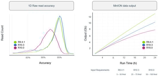 The comparison of performance using different types of nanopore. Oxford Nanopore Technologies Inc., Oxford, UK, 2020 [59].