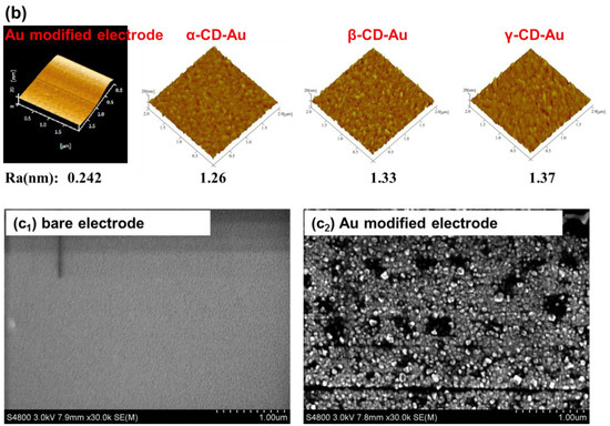 (a) XPS spectra for the surface of Au modified electrode and β-CD-Au modified electrode; (b) AFM images and roughness coefficients (Ra) of different modified surfaces; (c1) SEM images for bare electrode, and (c2) Au modified electrode.