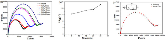 The impedance spectrum includes a semicircle portion corresponding to the electron-transfer-limiting process and a linear part resulting from the diffusion-limiting step of the electrochemical process [38]. The diameter of the semicircle exhibits the electron-transfer resistance (Ret) of the layer, which controls the electron-transfer kinetics of the redox probe at the electrode interface [39,40]. In Figure 4a, with the increase of the adsorption time, all diameters of the semicircles increased, and the increased amplitudes gradually became smaller in the time range of 15–20 min. There were many active sites on the surface of β-CD-Au modified electrode before 15 min, the adsorption rate was mainly affected by the diffusion rate, and the rate of adsorption was fast via monolayer absorption. In the range of 15–20 min, the adsorption rate was slower because the adsorption sites are gradually occupied. In the range of 20–25 min, the adsorption rate became faster again, probably due to the multilayer adsorption of LDL on the β-CD-Au modified electrode.