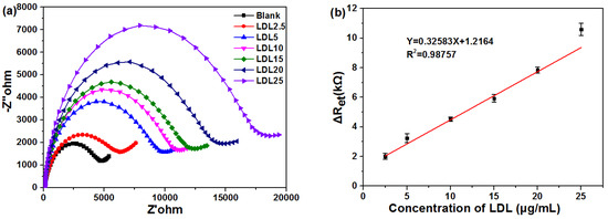 (a) Faradaic impedance spectra that corresponded to the fabricated sensor at 25 °C, before and after incubating with different concentrations of LDL in PBS (50 mM, pH 7.0) solution containing 0.1 M KCl and 5 mM K3[Fe(CN)6]/K4[Fe(CN)6]; (b) Calibration curve for the relationship of ΔRet with the LDL concentration.