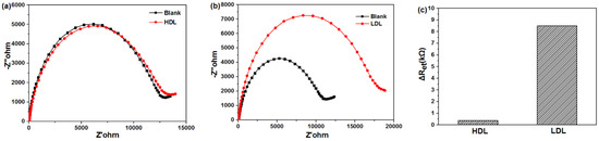 Faradaic impedance spectra that corresponded to the fabricated sensor at 25 °C, before and after incubating with same concentrations of (a) HDL, 20 μg/mL or (b) LDL, 20 μg/mL in PBS (50 mM, pH 7.0) solution containing 0.1 M KCl and 5 mM K3[Fe(CN)6]/K4[Fe(CN)6]; (c) ΔRet of different lipoprotein calculated to faradaic impedance spectra.