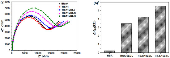 (a) Nyquist diagram of faradaic impedance spectra and (b) ΔRet of binary proteins for β-CD based sensor incubating in HSA/LDL binary proteins in PBS (50 mM, pH 7.0) solution containing 0.1 M KCl and 5 mM K3[Fe(CN)6]/K4[Fe(CN)6].