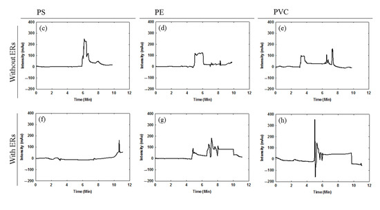 Liquid chromatography was used to verify the binding of micro-plastics to ERs following the detection conditions of SPR. According to the surface charge characteristics, the elution time for different micro-plastics staying in resins was different (Figure 3a), and when the ERs were immobilized, the separation effect was enhanced (Figure 3b). PS, with the largest surface charge, stayed in resins for the longest time; on the other hand, PVC stayed in resins for the shortest time because of the smallest surface charge [29,30]. However, regardless of whether the surface charge was high or low, we could not clearly distinguish the five particles of micro-plastics during the detection period. Once the ERs were immobilized on Ni-NTA, it was found that PE did not extend the elution time due to ERs’ effects. However, in the same situation, the elution time of PVC was extended by about 1.8 min, and that of PS was increased by nearly 5 min compared to resins. Therefore, we inferred that the surface charge influence on micro-plastics is a major factor, and the ERs played a supporting role, making the effect of surface charge an additive effect (Figure 3c–h). Due to the small surface charge between PE and PVC, the identified effects were not enhanced even with ERs supplemented.