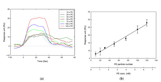 Refer to Dr. Jani et al. for the quantitative method of PS latexes by SPR [37]. The SPR experiments were performed on a SensiQ discovery device (ICX Nomadics, Oklahoma City, OK, USA) at 25 °C with PBS (pH 7.4) as the running buffer. Instrument operations and data processing were carried out with the SensiQ discovery Control software and QdatTM analysis software, respectively. Without hormone receptors immobilized on the COOH5 sensor chip (ICX Nomadics, Oklahoma City, OK, USA), the 20-micrometer PE micro-plastic stocks were diluted to a concentration series spanning 10–120 particles in 30 μL. When the flow rate was 50 μL/min and a steady state was displayed, 30 μL of PE micro-plastics of different concentrations was injected to observe the relationship between the response and concentration of various PE micro-plastics on sensor chips. Each experiment was verified by three replicates.