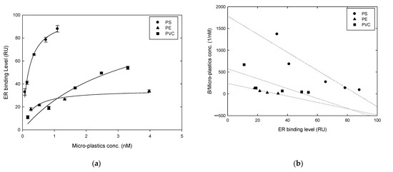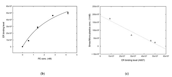 We plotted the ratio of the ER binding level (B) to the micro-plastic concentration () and the relative ER binding level (B), and the calculated slope was −1/kd (Figure 6b).