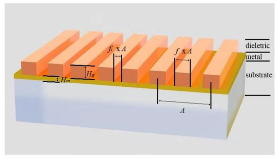 The proposed MADG structure that excites GMR is shown in Figure 1. On top of the SiO2 substrate, there is a metal reflector layer (Au) which is covered with a dielectric layer (HfO2, ng = 1.95) [27]. The metal reflector layer thickness is Hm. The dielectric layer is designed to be a double grating which is composed of two ridges with identical width in a period. With a grating period of Λ and fill factors f and fi, the width of each ridge is f × Λ, the interval between two ridges is fi × Λ, and the interval between two periods is (1 − 2f − fi) × Λ. The depth of the grating is Hg. The refractive index of the top medium surrounded the MADG structure is na. The resonant features and electric field distribution of the MADG-based GMR structure were simulated with COMSOL Multiphysics 5.2a (COMSOL Inc., Stockholm, Sweden) [28].