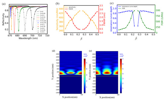 One more feature in Figure 2a is the depth of the resonance curve, which is defined as reflectivity at the inflection point minus the reflectivity at the resonance point. Figure 2c shows that the resonance curve depths are close to 0.8 with fi less than 0.2 and decrease sharply to around 0.1 with fi changing from 0.2 to 0.25. Since resonance signals with larger depth have better noise tolerating capability for better sensing performance, fi = 0.2 is used in the following simulations with which large sensitivity, large FOM and large resonance curve depth are all achievable.