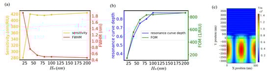 (a) Dependence of sensitivity and FWHM on Hm. (b) Dependence of FOM and resonance curve depth on Hm. (c) Electric field distribution of GMR with no metal reflector layer. For simulation, Λ was set at 500 nm, Hg at 300 nm, fill factor f at 0.25, and fi at 0.2.
