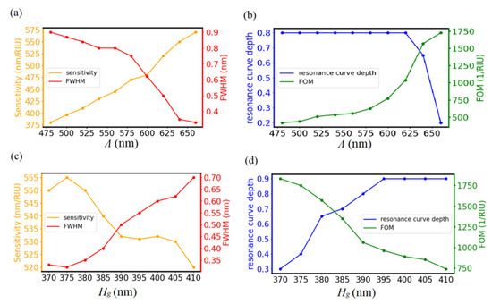 Figure 4a,b show the dependence of GMR performance on Λ with Hm at 100 nm, f at 0.25, and fi at 0.2. To obtain resonance curves under phase matching conditions with Λ ranging from 480 to 660 nm, Hg was set at 380 nm. It is clear that a large Λ provides high sensitivity and small FWHM, which is similar to the previous studies [34,35]. Even though both sensitivity and FOM monotonically increase with Λ within the range of simulations, resonance curve depths drop dramatically with Λ at 660 nm. In this case, Λ = 640 nm is used for following simulations. In addition, the resonant wavelength at Λ = 640 nm is 858.2 nm, which makes the as-designed sensor a promising candidate for applications with high sensitivity and relatively low absorption in water.