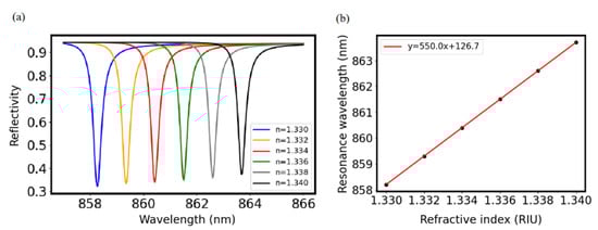 (a) Reflection spectra of the MADG-based GMR sensor immersed in liquids with increasing refractive indices. (b) Resonance wavelength of the MADG-based GMR sensor changes as a function of the liquid refractive index. For simulation, Λ was set at 640 nm, Hg at 380 nm, Hm at 100 nm, f at 0.25, and fi at 0.2.