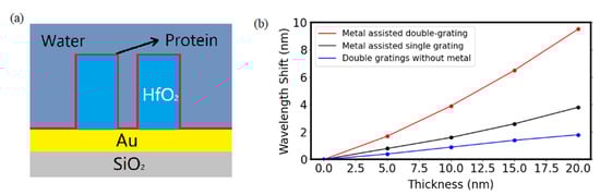 We then investigated the surface sensitivity with the protein sample adsorbing on the MADG-based GMR sensor. For simulation, we assumed a refractive index of 1.5 [36] and the protein thickness increasing from 0 nm to 20 nm to calculate the surface sensitivity [37]. Figure 6b shows the resonant wavelength of GMR as a function of the protein thickness. The sensitivity of MADG with double grating is 0.415 nm/nm, which is 2.4 times of that of metal assist single grating and 5.5 times of that of double grating without metal layer.