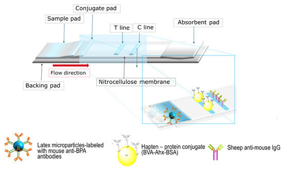 To our knowledge, this is the first work reporting the development of a latex-microparticle-based LFIA technique for the detection of BPA. Moreover, a new hapten–protein conjugate, including a C6 spacer (Ahx), was employed in conjunction with a commercially available anti-BPA antibody.