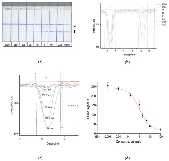 (a) Test strips with different concentration of BPA (in µg/L); (b) intensity profile of a test and control line and different concentrations of BPA; (c) evaluation of different test (T) line signals and baseline correction. The red horizontal line is the baseline for all signals (y2). The black horizontal line (at y1) is the example for concentration 0.001 µg/L (the maximal intensity (darkest) line, “Line max”, with the deepest intensity dip), the T Line Signal calculated as indicated by subtraction of the intensity values y2–y1 = 254 a.u. (d) Calibration curve obtained by plotting the mean of 3 replicates (n = 3) against BPA calibrator concentrations. The standard deviation (SD) was calculated from the replicates and is shown as error bars.