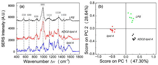 Meningococcal LPS Raman SERS spectra. (a) SERS spectra of LPS, KDO2-lipid A, and lipid A obtained from Neisseria meningitidis endotoxin structures. (b) The PCA score plot of SERS spectra of LPS, KDO2-lipid A, and lipid A.